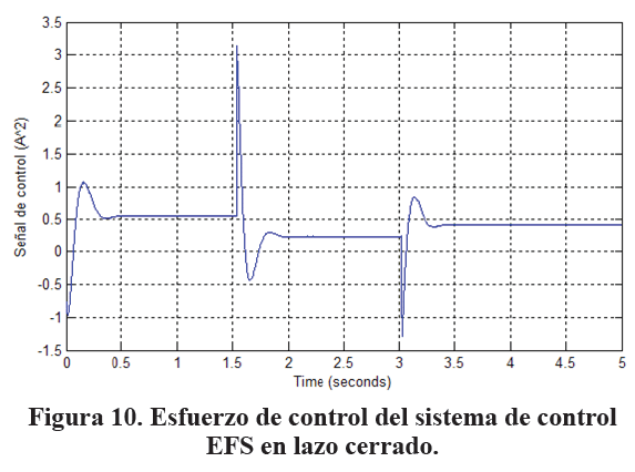 El esfuerzo de control del sistema se puede observar en la Fig. 10, su valor pico es de 3.1 A2, por tanto el consumo máximo de corriente es entonces de 1.76 A. Es decir el sistema cumple con los requisitos de diseños planteados, esto claro está usando una función de membresía sigmoidal, la cual es la que mejor representa al comportamiento sistemas no lineales.