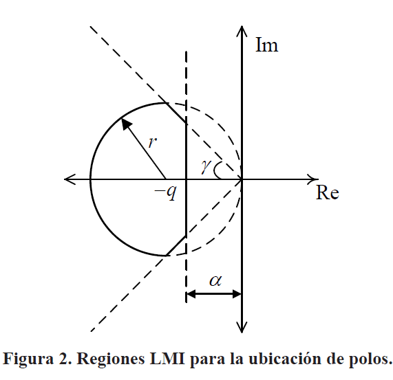Siendo f (Ai, Bi) y f1 (Ai, Bi) definidas por (38) y (39), para todo i, j = 1, 2,..., r excepto los pares (i, j) tales que hi (z (t)) h j ( z(t)) = 0, ∀t. Con K i = Mi X−1 . En la Fig. 2 están representadas las regiones LMI (sector semiplano izquierdo, sector disco y sector cono) en el plano complejo.