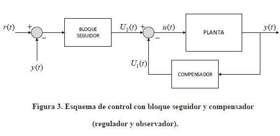 El seguidor consiste en una acción integral y una ganancia Vi , con i = 1,..., r que permite eliminar el error de estado estable en la salida, Fig. 5. Para ello una nueva variable xe es introducida para integrar el error de seguimiento, es definida como: