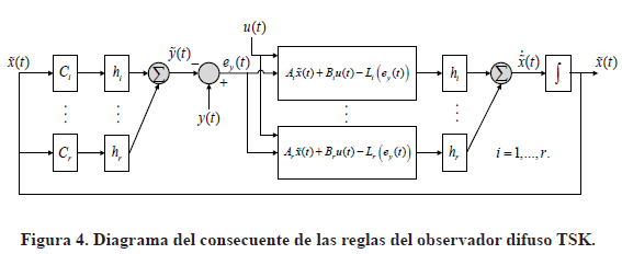 Finalmente, en la Fig. 4 se tiene el diagrama correspondiente al consecuente de las reglas difusas del observador TSK, cuyos estados y salidas estimadas son calculados por (49) y (50), que se explican a continuación.