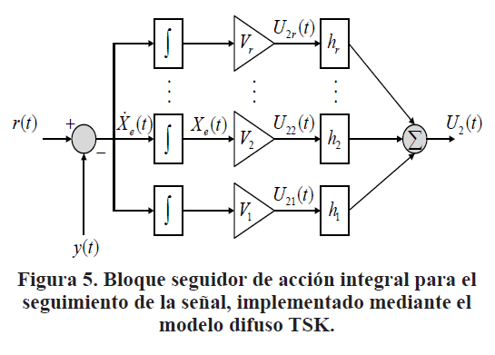 En la Fig. 3 se observa el sistema en lazo cerrado, donde la planta se asume representada en ecuaciones integro-diferenciales y en el bloque del controlador difuso se encuentra implementado el algoritmo TSK. Este algoritmo consiste en un bloque seguidor y un compensador difuso TSK (regulador y observador), lo cual termina derivando en un algoritmo EFS.