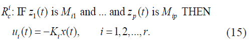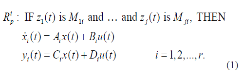 Los modelos difusos continuo TSK están descritos por reglas IF-THEN, la cuales representan relaciones lineales de entrada y salida locales de un sistema no lineal, como en (1). En nuestro caso el modelo difuso TSK de la planta estará formado por un conjunto de reglas difusas. El antecedente de cada regla contiene la descripción lingüística de las variables premisas y el consecuente contiene los modelos lineales locales (subsistemas) del sistema no lineal.