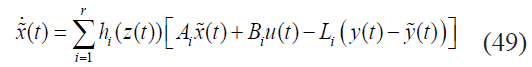de estados de la planta y los vectores de estados estimados. Se puede entonces diseñar un observador difuso TSK de acuerdo con [6]