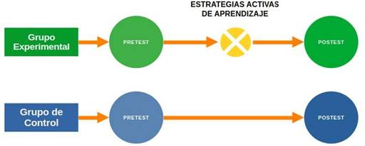 En la figura 1 se presenta el esquema de trabajo desarrollado, se observa que el grupo de control recibió una intervención tradicional, mientras que el grupo experimental recibió una intervención basada en estrategias activas, donde se implementaron a través de 15 sesiones.