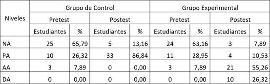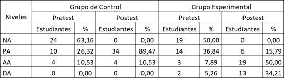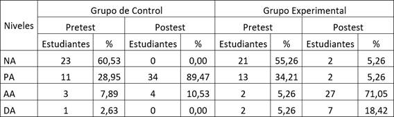 Los resultados iniciales del pretest, tal como se observa en la Tabla 2, tanto el grupo experimental como el grupo control presentaban un alto número de estudiantes en el nivel más bajo de desempeño. Por otro lado, ninguno de los estudiantes de ambos grupos alcanzó el nivel más alto. Este escenario inicial fue respaldado estadísticamente por la prueba de rangos de Mann-Whitney, lo que indica que no existían diferencias significativas entre los grupos antes de la intervención, asegurando condiciones equivalentes para evaluar el impacto de las estrategias activas de aprendizaje.