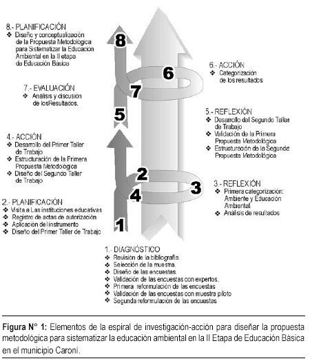 El proceso de investigación-acción (Martínez, 1999) desarrollado se basó en una serie de ocho (8) momentos interactivos, cuyas acciones específicas se enuncian en la figura Nº 1. Se identificaron dos fases centrales para el desarrollo del mismo, una que permitiera en primer lugar identificar los elementos asociados a la EA desde el quehacer educativo del docente, el programa oficial y su relación con lo ambiental como espacio de interacción local de la escuela. En segundo lugar, identificar los requerimientos de los actores que permitirán construir una metodología para vincular estratégicamente las herramientas existentes en el contexto educativo (programas, proyectos pedagógicos, enfoques pedagógicos, formación del docente, realidad de la institución, entorno de la comunidad) con el proceso de la E.A. (Novo, ob. cit)