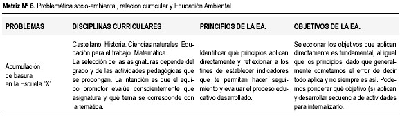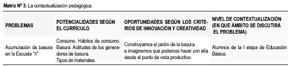 Las matrices: son una serie de cualidades del contexto educativo-ambiental que permiten ir construyendo desde la reflexión una propuesta pedagógica, con base en el reconocimiento de los saberes de los actores. Ellas están interrelacionadas, por ello, es conveniente analizar al momento de completar cada una de sus casillas sobre la base de establecer enlaces recursivos que permiten evidenciar el enfoque sistémico de los elementos componentes de la reflexión.