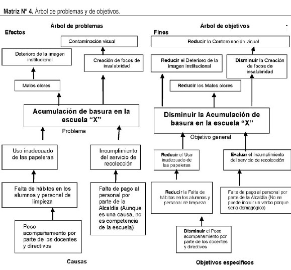 El árbol de problemas: son instrumentos de planificación que permiten visualizar las relaciones entre los problemas (el tronco) las causas que lo generan (las raíces) y los efectos (las ramas). Es una metodología propuesta por el Centro Español de Estudios de América Latina para el desarrollo de los proyectos bajo el enfoque de marco lógico. Su utilización en el proceso de la PMSEA facilita la comprensión y apropiación de los problemas desde la red compleja de acciones que ella representa. El árbol de problemas, como su nombre lo indica, representa los escenarios en negativo, y el árbol de objetivos representa la acción en positivo del equipo promotor, sin desviar el centro de acción; es decir, sólo debemos realizar un ejercicio de redacción sin alterar la oración inicial del árbol de problemas en su estructura, sólo se debe anteponer un verbo en positivo relacionado con las competencias que tengan el equipo promotor sobre el problema.