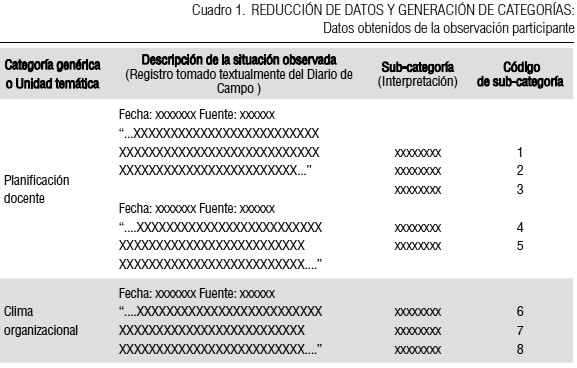 Así por ejemplo, para organizar los datos e iniciar el proceso de categorización producto de la aplicación de la técnica de la Observación participante, podrán emigrarse los datos registrados en el Diario de campo trasladándolos hacia algún otro formato que facilite este procedimiento (Cuadro 1); de allí que se podrá iniciar el proceso, utilizando la modalidad de categoría genérica, macro-categoría o unidad temática (Cuadro 1, primera columna) con el propósito de establecer un orden lógico de los registros descriptivos. De manera similar, también se organizan los datos derivados de las técnicas de la entrevista en profundidad y revisión documental (Cuadro 2 y 3), con algunas variaciones, dada la particularidad de cada una. Por otro lado, conviene organizar la información correspondiente a cada técnica en cuadros por separado para facilitar la codificación consecutiva de las sub-categorías que van emergiendo de la interpretación pormenorizada de lo registrado, tal como se aprecia en la columna 3 (Cuadro 1), en la columna 4 (Cuadro 2) y en la columna 3 (Cuadro 3). Ahora bien, para trasladar la información registrada en los Diarios de campo, producto de la técnica de la observación participante, deben aplicarse los procesos mentales de identificación, reconocimiento, interpretación, comparación y clasificación que le permitan al investigador emigrar los datos desde el Diario hacia el Cuadro 1 y ubicarlos, en bloque, en la segunda columna correspondiente a la Descripción de las situaciones observadas. Lo observado en la columna 4 del mismo cuadro, corresponde al número asignado como código a la sub-categoría.