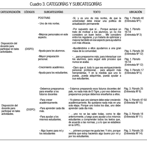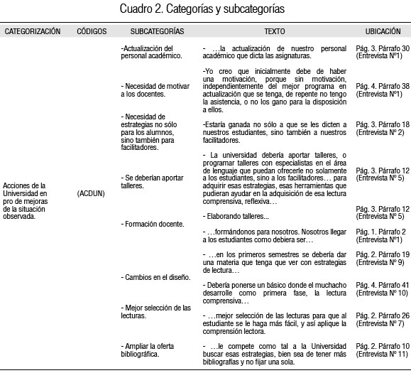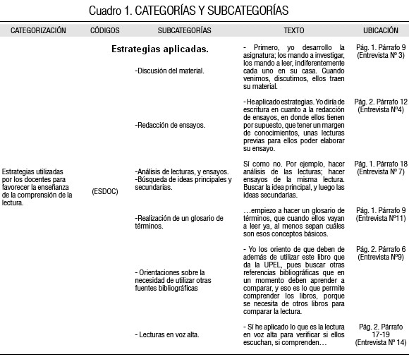 Se crearon tres categorías, a saber: ESDOC (Estrategias utilizadas por los docentes para orientar la comprensión de la lectura en el aula); ACDUN (Acciones de la universidad en pro de la solución de la situación planteada); Y DISPO (Disponibilidad de los docentes para participar en tales acciones), las cuales como se verá luego reúnen el total de discursos recogidos en esta oportunidad.