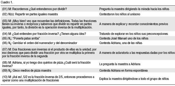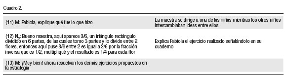 Sobre la base de los ejercicios resueltos, se generó la interacción, mostrada en el Cuadro 2, entre la maestra y los niños.