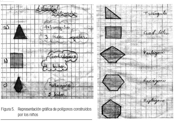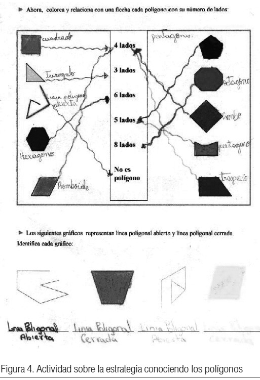 El siguiente evento referido al contenido Polígonos y cuya estrategia se denominó Conociendo los polígonos, tuvo como propósito que los niños comprendieran su significado y clasificación. Las evidencias fueron recolectadas a través de imágenes de video y de los cuadernos de los niños. La clase comenzó en horas de la mañana, donde prevalecía un ambiente alegre y amistoso propicio para el logro de aprendizajes. Los niños conformados en equipos de trabajo comenzaron a realizar las actividades de la estrategia, tal como se muestra en la Figura 4.