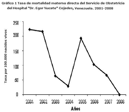En el diseño del estudio, la población la constituyeron todas las embarazadas en edades comprendidas entre 12 y 49 años, o dentro de los 42 días siguientes a la terminación del embarazo, que asistieron a la emergencia y área de hospitalización de obstetricia y ginecología del Hospital Egor Nucete, durante el periodo 2001-2008, con alguna patología pre-existente o de reciente aparición, excepto las que consultaron por causas accidentales o incidentales. Durante este lapso hubo 23.228 pacientes embarazadas con alteración en su estado de salud. Asimismo, la mortalidad materna se midió a través de la tasa de mortalidad materna, la más frecuentemente utilizada, la cual constituye una medida del riesgo de muerte de una mujer después de que se embaraza, y definida como el número de defunciones maternas durante un período determinado de tiempo por cada 100.000 nacidos vivos registrados durante el mismo período. La información se recolectó en formularios diseñados especialmente para la investigación, luego se trasladó a una base de datos computarizada, se procesó y tabuló con el programa estadístico Epi Info (22).