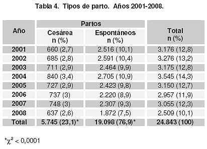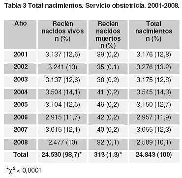 El promedio de edad de las pacientes fue de 22,6 años y el rango se ubicó entre 11 y 51 años, con predominio de las adolescentes (28,5%) en este grupo de mujeres. Se produjeron 24.843 nacimientos; de éstos, 24.530 (98,7%) nacieron vivos, en evidente diferencia estadística con los nacidos muertos que sólo representan 1,3% de los recién nacidos (p<0.0001) (Tabla 3).