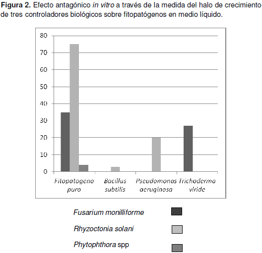 Las primeras tres barras representan el crecimiento del fitopatógeno cultivado puro a partir del medio líquido. Las barras siguientes representan el crecimiento del fitopatógeno una vez que este es sembrado con el antagonista en medio líquido. Se puede apreciar que el crecimiento del fitopatógeno es mayor cuando este es sembrado puro. Además, cuando se siembra en presencia del antagonista este inhibe el crecimiento del fitopatógeno. Cuando los fitopatógenos son enfrentados a B. subtilis y P. aeruginosa en medio líquido se aprecia como el crecimiento de F. monilliforme y Phytophthora spp es inhibido totalmente. Sin embargo, y coincidiendo con la figura 1, R. solani mostró ligera resistencia, obteniéndose 3 mm y 20 mm relativamente de crecimiento sobre el agar. En el caso de T. viride se aprecia que inhibe a R. solani y Phytophthora spp, con ligero crecimiento de F. monilliforme (27mm). El análisis estadístico arrojo que existen diferencias significativas entre los fitopatógenos cuando se siembran puros en relación a los sembrados con el antagonista (p<0,10).