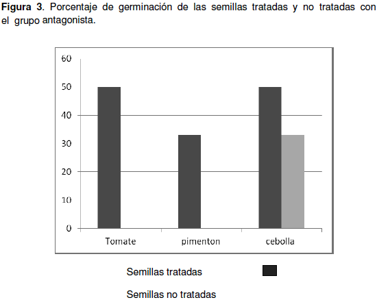En la figura 3 se observa como existe una mayor germinación de semillas tratadas de tomate, pimentón y cebolla, en comparación a las semillas no tratadas (p=0,8165).