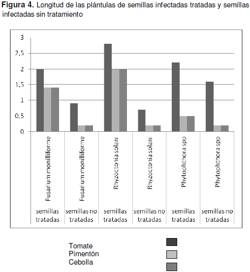 En la figura 4 se aprecia que las plántulas de semillas tratadas posterior a la infección, presentaron una longitud mayor que aquellas que fueron infectadas y no tratadas. En cuanto al análisis estadístico se evidenció que existen diferencias significativas entre la longitud de las plantas tratadas en relación a las no tratadas en cuanto a cada rubro. Tomate (p=0,0004), pimentón (p=0,0024) y cebolla (p=0,0006). Además se observó que el comportamiento de cada antagonista es específico en cada caso, es decir, que no se evidenció diferencia significativa en cuanto a poder antagonista de cada uno.