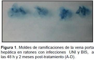 La metodología de moldes de ramificaciones de la vena porta, se empleó con éxito para estudiar el proceso de neovascularización previa obstrucción parcial de la circulación de la vena porta hepática como un medio de inducir hipertensión portal (3) y en el estudio de los vasos sanguíneos hepáticos en ratas infectadas con Fasciola hepática (14). La ausencia o el discreto aumento en neovascularización en nuestros resultados se puede explicar sobre la base a que la naturaleza e intensidad del daño al tejido vascular en la infección UNI o BIS es menor que el ocasionado por agentes químicos (9), así como el tiempo de evaluación ( 8 semanas) de infección en este trabajo.