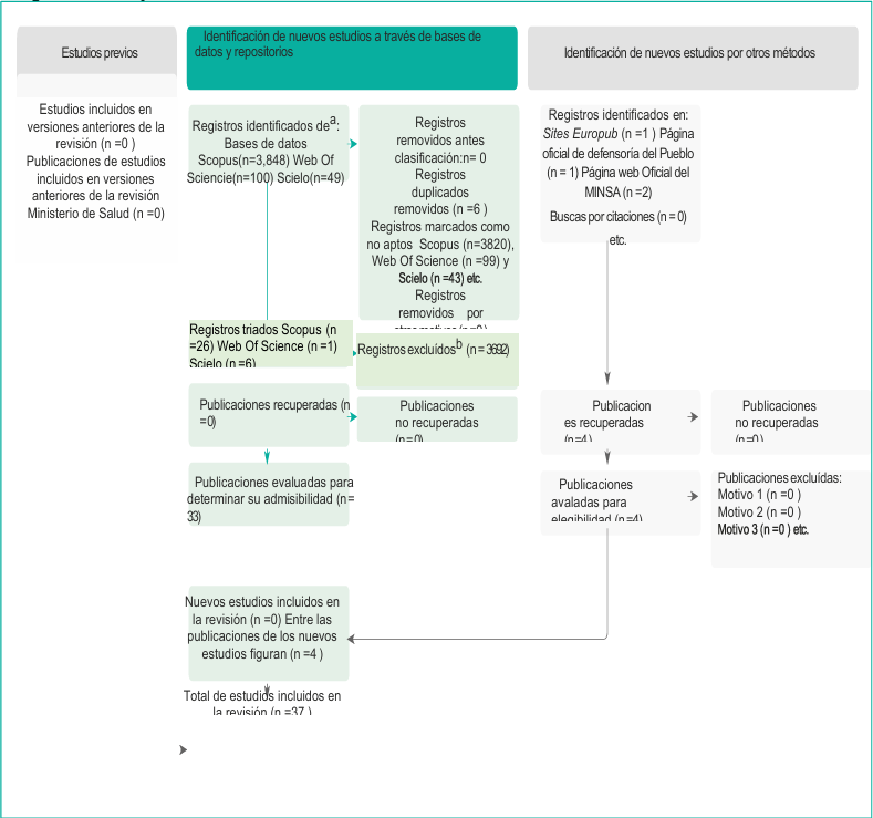 Del total de artículos encontrados, se aprecia lo siguiente: de la base de datos de Scopus: 3,848 documentos, se usaron, 28, se descartaron 3820; de los artículos de la base de datos de Web of Science: 100 documentos, se utilizó 1 artículo, se descartaron 99, artículos y de la base de datos de Scielo: 49 encontrados, se utilizaron 6, se descartaron 43 artículos, otras búsquedas a través de Internet: 1 un artículo indexada a la base de datos EUROPUB: se descartaron 0 y se identificaron información relevante en dos páginas web oficial de gobierno uno en la Defensoría del pueblo y otro en Minsa total de documentos 37.