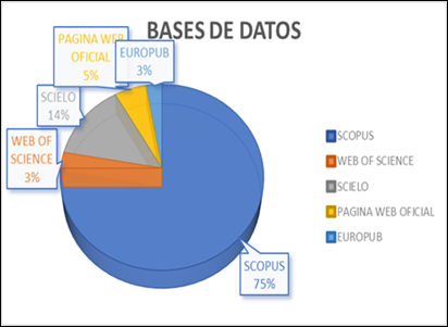 De la producción de información se denota que el 75% corresponden a la base de datos de Scopus, el 14% corresponde a Scielo, 3% a Web Of Sciencie, 3% EUROPUB y 3% corresponden a información de internet (Paginas web oficial y un artículo), de ello se explica que el nivel de información utilizada en el artículo es de un nivel optimo debido a que la mayoría de artículos usados son de Scopus que estan en nivel Q1, Q2 y Q3 siendo pocos de Q4.