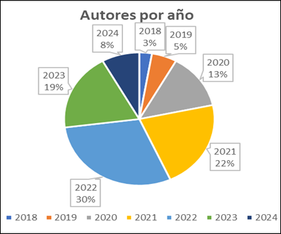 En relación a los autores por año se apreciar que el 3% es del 2018, 5% del 2019, 13% del 2020, 22% de 2021, 30% del 2022, 19% del 2023 y 8% el 2024, de ello se denota que en el año 2022 es donde hubo mayores investigaciones en relación al tema y por lo tanto aportaron mayor información.