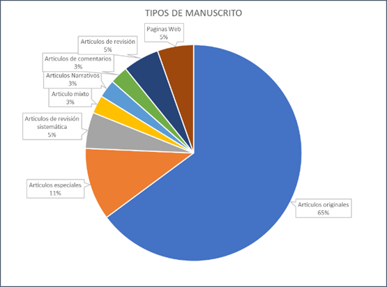 De la distribución de los artículos se tiene que 65% son artículos originales que esta en el nivel mas alto, el 11% son artículos especiales, 5% de revisión sistemática, 5% artículos de revisón, 3% artículos mixto, 3% paginas web, 5% artículos narrativos y 3% artículos de comentarios, lo cual denota el alto nivel de la investigación.