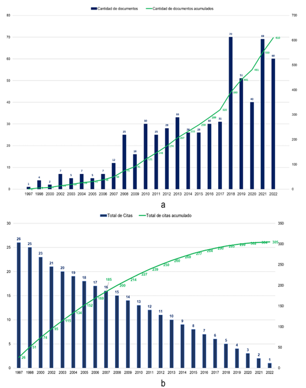 | Producción e impacto | Representa el comportamiento anual y acumulado de la producción científica y de citas. | Evolución de la producción anual de documentos y citas. |