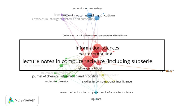 El acoplamiento de revistas (Figura 4) mostró las más frecuentes en las referencias bibliográficas, tendencia de citación que expresa la relación temática, donde destacan tres revistas internacionales: Lecture Notes in Computer Science, Information Scienes y Neurocomputing. En ellas se abordaron temáticas relacionadas con las Ciencias de la Computación, la Inteligencia artificial, las aplicaciones de la ciencia de la computación y software. Este resultado es consistente con el alcanzado mediante el acoplamiento de documentos.