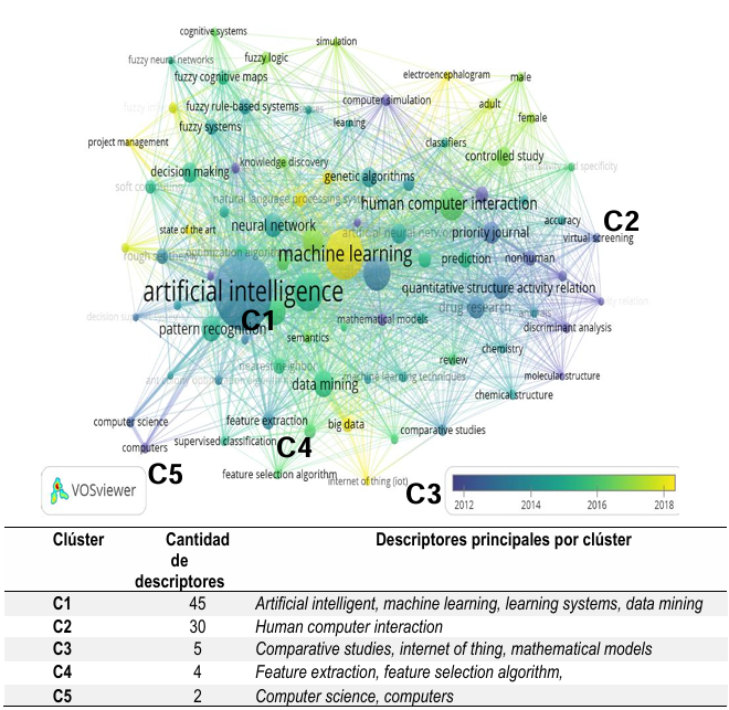 La coocurrencia terminológica posibilita el establecimiento de las principales categorías, líneas de investigación y relaciones temáticas dentro de una determinada área de conocimientos. Además, se tomó en cuenta la representación por superposición, procedimiento que ofrece una aproximación a la evolución temporal de las líneas temáticas (Figura 5). Como resultado, se obtuvo una imagen más clara de las tendencias en cuanto a indexación por palabras clave en el periodo estudiado, donde destacaron los siguientes términos: artificial inteligente, machine learning, learning systems, human computer interaction y data minning.