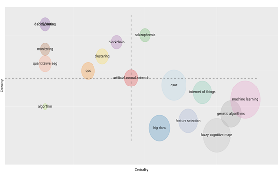 Dentro del cuadrante que agrupa los temas aislados, pero con cierto desarrollo se observaron el blockchain, el agrupamiento (clustering) el cual es la principal tarea de la minería de datos exploratoria y es una técnica común en el análisis de datos estadísticos. También se encontró la electroencefalografía cuantitativa (Quantitative egg) o mapeo cerebral, que está relacionado con el análisis numérico de los datos de electroencefalografía y los correlatos de comportamiento asociados a los patrones de comunicación cerebral que se establecen a partir de la medición de la actividad bioeléctrica generada principalmente por potenciales postsinápticos de las neuronas piramidales del córtex cerebral, así como la monitorización (monitoring); la cual es utilizada para el seguimiento y control médico de pacientes, pero también como un modelo de entrega informática en la nube que ofrece múltiples beneficios para las empresa.