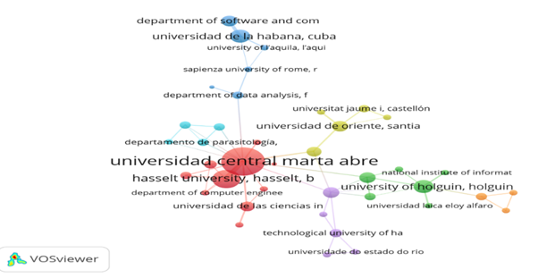 En la red de instituciones en 7 clústeres se observó la importante colaboración de universidades nacionales (Figura 8), dentro de ella la que tuvo mayor relevancia fue la Universidad Central Marta Abreu de las Villas (UCLV), líder en producción científica, con el mayor peso en la generación de conocimiento en los temas que integran las TH a nivel nacional en revistas de Scopus, además de tener una posición clave dentro de la red. A ella le continuó, a nivel nacional, la Universidad de la Habana.