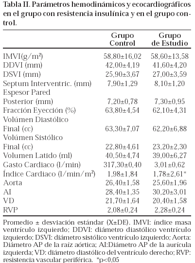 El promedio del índice cardiaco fue significativamente menor (p<0,05) en el grupo con resistencia a la insulina; la cifra promedio del gasto cardiaco estuvo por debajo del limite inferior de la normalidad pero no fue estadísticamente diferente al compararla con el grupo control. La resistencia vascular periférica se encontró por encima del límite superior de la normalidad, pero la diferencia con respecto al grupo control no fue significativa. El resto de las variables ecogradiográficas medidas fue similar en ambos grupos (TablaII).