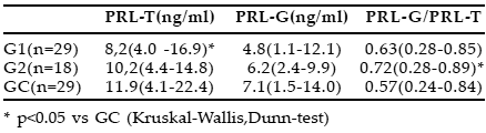 Conclusiones: - Confirmamos la presencia de concentraciones mensurables de PRL-G durante la menopausia. - Observamos en la mujer menopáusica no sólo valores disminuidos de PRLT sino también una mayor proporción de PRL-G. Ambos hechos podrían responder a un menor requerimiento de bioactividad de Prolactina en esta etapa. La falta de significación estadística de PRL-G/PRL-T en G1 podría ser tiempo y edad dependiente. - Finalmente, cabría la posibilidad que PRL-G, además de su función inmunomoduladora pueda cumplir otros roles, como lo descripto para PRL-T.