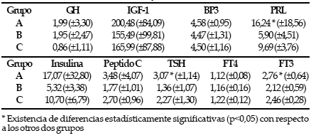 Los ejes corticotropo, las hormonas implicadas en el metabolismo del calcio y las hormonas sexuales, así como el perfil glicémico, perfil lipídico, perfil hepático y perfil bioquímico en general, no presentan diferencias estadísticamente significativas entre grupos. Sí se encontraron diferencias estadísticamente significativas en la PRL, TSH y FT3 de pacientes con acromegaloidismo respecto a los otros grupos. Conclusiones: En el acromegaloidismo existe un aumento significativo en los niveles circulantes de PRL, hay un aumento de la actividad del eje tiroideo de origen central y se observa que los niveles medios de todas las hormonas hipofisarias y de las principales de cada eje aparecen en la zona alta del rango de normalidad.