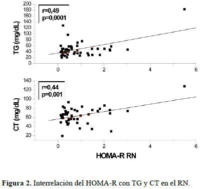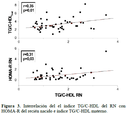 Resultados: El Δpeso materno se correlacionó positivamente con PFE y peso del RN (r=0,32, p<0,02; r=0,32, p<0,05). El HOMA-R del RN se relacionó positivamente con CT (r=0,46; p<0,01) y TG (r=0,52; p<0,0001). El índice TG/C-HDL del RN se correlacionó positivamente con índices HOMA-R y TG/C-HDLmat (r=0,31, p=0,03; r=0,35, p=0,01). El peso pregestacional, materno final, placentario y TG maternos fueron significativamente más altos en los RN de mayor peso. Los índices TG/C-HDLmat y HOMA-Rmat se relacionaron inversamente con los índices QUICKImat y HOMA-Smat (p<0,01).