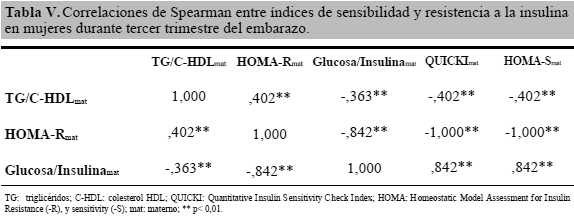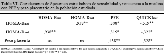 En la tabla V se muestra la interrelación entre los índices de sensibilidad y resistencia insulínica en mujeres durante el tercer trimestre del embarazo. El índice TG/C-HDL y HOMA-R se relacionaron inversa y significativamente con el cociente glucosa/insulina, QUICKI y HOMA-S (p < 0,01). El PFE se relacionó positivamente con HOMA-B, HOMA-D materno (mat) ( p< 0,05 respectivamente) y peso de la placenta (p<0,01). El QUICKI mat mostró una correlación inversa y significativa con el HOMA-B, HOMA-D mat (p< 0,01; p < 0,05 respectivamente) y peso de la placenta (p <0,05) (Tabla VI).
