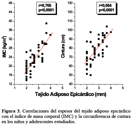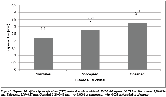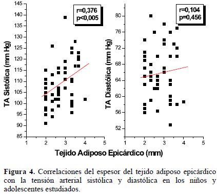 Recientemente ha aumentado el estudio del espesor del TAE medido ecocardiográficamente en niños y adolescentes; diferentes autores han demostrado que el espesor del TAE es significativamente mayor en los obesos desde la edad infantil y la adolescencia, en comparación con aquellos con IMC normal7,8,24,25. En población latina, Cabrera-Rego y col26 reportaron valores significativamente mayores del espesor del TAE en niños y adolescentes obesos en comparación con controles, así como una correlación positiva y significativa con el grosor íntima-media carotideo, la rigidez arterial y variables de la geometría cardiaca.