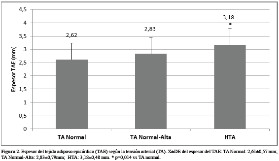 En la Fig. 2 se observa que el espesor del TAE se incrementa en los grupos con mayores valores de TA; en el grupo de hipertensos fue de 3,18±0,48 mm, en el de TA Normal-Alta fue de 2,83±0,79 mm y en el de normotensos de 2,61±0,57 mm. Fueron significativamente mayores los valores del grupo de hipertensos en comparación con los de TA normal (p=0,01).