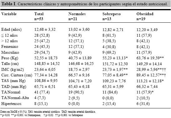 En la tabla I se presentan las características generales de los 53 participantes según el estado nutricional. La edad promedio fue de 12,68 ± 3,32, rango de 6,91 a 18,41 años, 28 (52,8%) eran de 12 años de edad o menores y 25 (47,2%) mayores de 12 años; el 45,3% fueron de sexo femenino y 54,7% de masculino. Según el estado nutricional, 21 (39,6%) eran normales, 13 (24,5%) estaban en sobrepeso y 19 (35,9%) en obesidad. No hubo diferencias por edad y sexo entre los grupos. El peso, el IMC y la CC estuvieron significativamente más altos en el grupo de obesidad y sobrepeso, en comparación con aquellos en estado nutricional normal y en el grupo de obesos en comparación con el grupo de sobrepeso. La tensión arterial sistólica (TAS) fue significativamente mayor en los obesos en comparación con el grupo de estado nutricional normal (p<0,01). El 77,4% (n=41) tenía TA normal, 7,5% (n=4) TA normal-alta (mayor al pc 90) y 15,1% (n=8) era hipertenso; se observó un porcentaje significativamente mayor de TA Normal-Alta y de HTA en el grupo con obesidad (p=0,05).