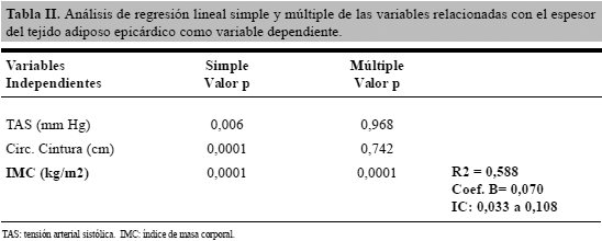 Se realizó un análisis de regresión lineal para determinar las variables que más influyen sobre el espesor del TAE como variable dependiente en la muestra estudiada. En el análisis de regresión lineal simple, se encontró que la TAS (p=0,006), la cintura y el IMC (p=0,0001 para ambas) fueron significativas, pero en el análisis de regresión lineal múltiple se observó que las variables TAS y cintura perdieron su significancia estadística, mientras que el IMC, siguió manteniendo su significancia (p=0,0001), quedando ésta como la variable que más influye sobre el espesor del TAE, con un R cuadrado de 0,588 (Tabla II).