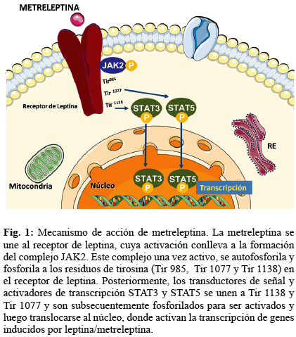 A nivel molecular, la metreleptina comparte homología estructural con la interleuquina 6 (IL-6), IL-11, IL-12 y la oncostatina M, las cuales son miembros de la familia de citoquinas helicoidales de cadena larga 10. La metreleptina se une y activa el receptor de leptina humana, perteneciente a la familia de receptores de citoquina clase I, y su mecanismo de acción es mediado por la vía de señalización celular JAK/STAT (Figura 1) 11.