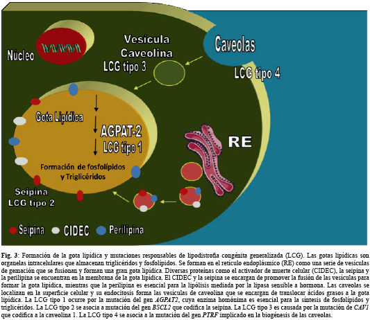 El gen AGPAT2 codifica la enzima 1-acilglicerol-3-fosfato O-aciltransferasa-2, la cual convierte el ácido lisofosfatídico en ácido fosfatídico, un paso importante en la síntesis de novo de fosfolípidos y triglicéridos 23. El gen BSCL2 codifica la proteína seipina, cuyo papel es crítico en la adipogenesis normal y además debido a su localización en el retículo endoplásmico, participa en el plegamiento proteico y la formación de la gota lipídica 24. Por su parte, la lipodistrofia congénita generalizada tipo 3 ha sido descrita solo en un paciente y es causada por la mutación del gen CAV1 que codifica a la caveolina 1 encargada de transportar y translocar ácidos grasos hacia la gota lipídica25. La lipodistrofia congénita generalizada tipo 4 ha sido diagnosticada en 21 pacientes y se asocia a mutaciones en el gen PTRF que codifica a la cavina, cuya participación es crítica en la biogénesis de las caveolas y controla la expresión de caveolina 1 y 3 26 (Figura 3).