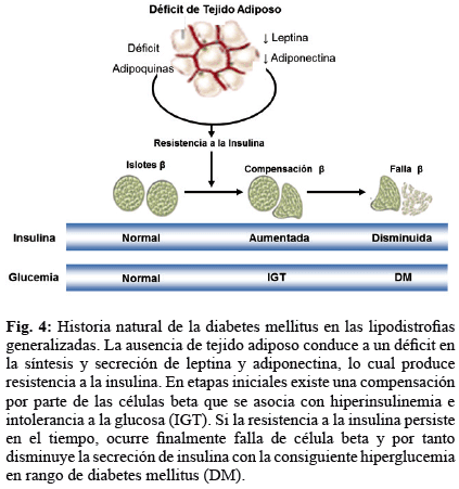 Las complicaciones metabólicas ocurren por ausencia de tejido adiposo para el almacenamiento eficiente de triglicéridos tanto de la dieta como provenientes de la síntesis endógena en el hígado 29. Este fenómeno conlleva a un mayor flujo de ácidos grasos libres a otros órganos tales como el hígado y el músculo esquelético, que resulta en esteatosis 18. Algunos pacientes pueden desarrollar posteriormente esteatohepatitis que progresa a fibrosis y cirrosis. Además, el déficit de leptina acentúa las alteraciones metabólicas induciendo hiperfagia y favoreciendo junto con el déficit de adiponectina la aparición de resistencia a la insulina.