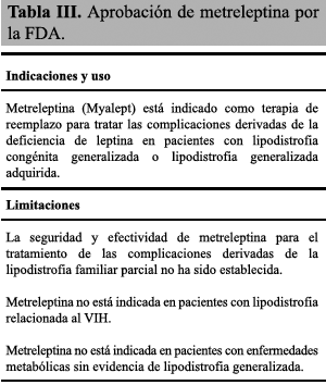 La metreleptina recibió la designación de droga huérfana en el año 2001 y fue desarrollada por Amylin Pharmaceuticals. Globalmente, fue aprobada primero en Japón el 25 de Marzo del 2013 para el tratamiento de la lipodistrofia 16. Posteriormente, el 25 de Febrero del 2014 la FDA la aprobó para el tratamiento de la lipodistrofia generalizada y sus complicaciones (Tabla III) 2. Finalmente, en Noviembre del 2014, Aegerion Pharmaceuticals adquirió los derechos de desarrollo, manufactura y comercialización del fármaco 17.