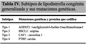 Hasta el momento se han identificado 4 genes, cuyas mutaciones son responsables de este síndrome (Tabla IV). Las mutaciones de los genes AGPAT2 y BSCL2 son responsables del 95% de los casos reportados (tipo 1 y tipo 2 respectivamente). La mutación del gen CAV1 es responsable de la lipodistrofia congénita generalizada tipo 3 y la tipo 4 es ocasionada por mutaciones del gen PTRF 18.