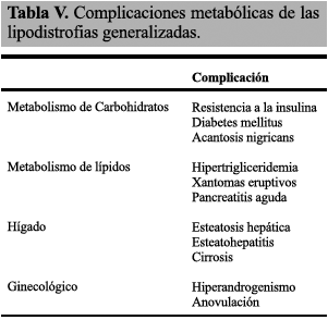 Las pacientes con lipodistrofia generalizada con frecuencia presentan hipertricosis, hirsutismo, clítoromegalia y trastornos del ciclo menstrual 32,33. El mecanismo implicado en esta alteración metabólica no ha sido completamente dilucidado, sin embargo, es bien conocido que la hiperinsulinemia estimula una mayor producción de andrógenos ováricos34. La anovulación puede deberse por una parte al hiperandrogenismo ovárico y por otra a la estimulación irregular de la hormona luteinizante (LH) como consecuencia de la hipoleptinemia 35. Las complicaciones metabólicas de las lipodistrofias generalizadas se resumen en la Tabla V.