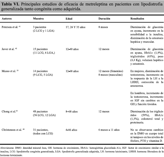En la Tabla VI se resumen algunos ensayos clínicos donde se evaluó la eficacia de metreleptina en pacientes con lipodistrofia generalizada tanto congénita como adquirida.