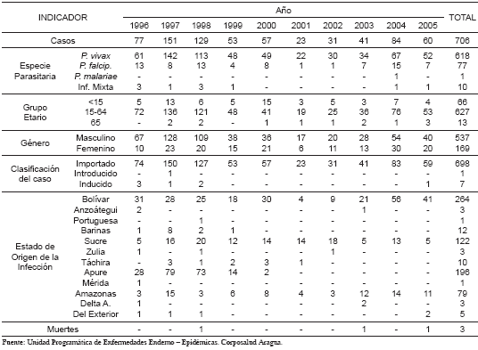 Tabla I. Resumen epidemiológico de la malaria, estado Aragua (1996 2005).