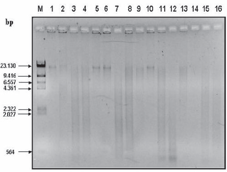 Fig. 1. Quality of Anopheles darlingi DNA preserved in isopropanol and collected from different localities of Bolivar State. Ethidiumbromide- stained agarose gel of 1 μg of DNA from An.darlingi adult mosquitoes. The electrophoresis was performed with 16 different mosquito samples. Lanes 1-4 are samples from Puerto Fortin, Lanes 5-8 are samples from Corobal, Lanes 9-12 are samples from El Banco, Lanes 13-16 are samples from El Piñal. Lane M corresponds to base pairs markers (Lambda DNA Hind III markers from Promega) with the markers (bp) as indicated.
