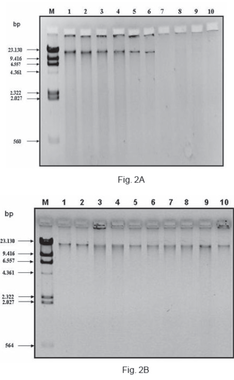 Fig. 2: Comparison of An. darlingi DNA from mosquitoes preserved in isopropanol or liquid N2 as a function of the RH. Ethidium-bromide-stained agarose gel of DNA from An.darlingi adult mosquitoes. The electrophoresis was performed with different mosquitoes from Corobal. (A) Samples preserved in isopropanol were collected, exposed at the ambient RH for 0 and 30 min and placed in isopropanol as described in the text. The first and second lanes of each experiment represent the 0 and 30 min respectively. Lanes 1-2 at 87% RH, lanes 3-4 at 89% RH, lanes 5-6 at 91% RH, lanes 7-8 at 93% RH, lanes 9-10 at 95% RH. (B) Samples preserved in liquid N2 were collected, exposed at the ambient RH for 0 and 30 min and placed in liquid N2 as described in the text. Lanes 1-2 at 87% RH, lanes 3-4 at 89% RH, lanes 5-6 at 91% RH, lanes 7-8 at 93% RH, lanes 9-10 at 95% RH. Lane M corresponds to the same base pairs markers indicated in Fig. 1.